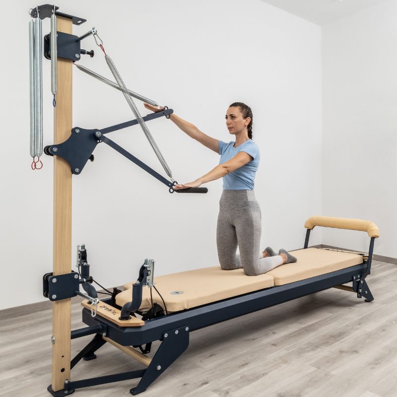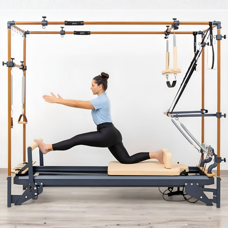 Cadillac Reformer – A space-saving blend of reformer and Cadillac, offering full-studio versatility in one steel-built unit, with two platform height options.